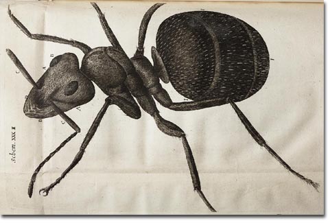 And thus I dealt with this Ant, which I have here delineated, which was one of many, of a very large kind, that inhabited under the Roots of a Tree, from whence they would sally out in great parties, and make most grievous havock of the Flowers and Fruits, in the ambient Garden, and return back again very expertly, by the same wayes and paths they went.